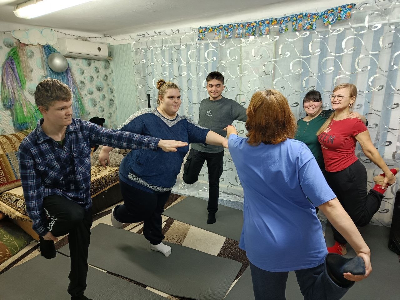 За 4 часах занятий по Адаптивной физкультуре, педагог-Данилян Т.Л. , выполняла с Целевой Группой упражнения на выпрямление позвоночника. Игра в путешествие на Северный Полюс, помогла ребятам почувствовать себя в той стихии в качестве и человека, и собачки, совы.. изображая данных персонажей, они упражнялись в растяжке и укреплении мышц позвоночника.